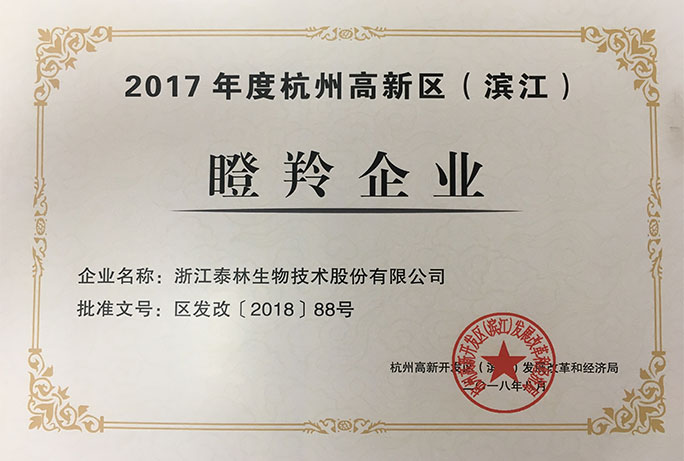 泰林生物連續3年獲評高新區(濱江)瞪羚企業稱號