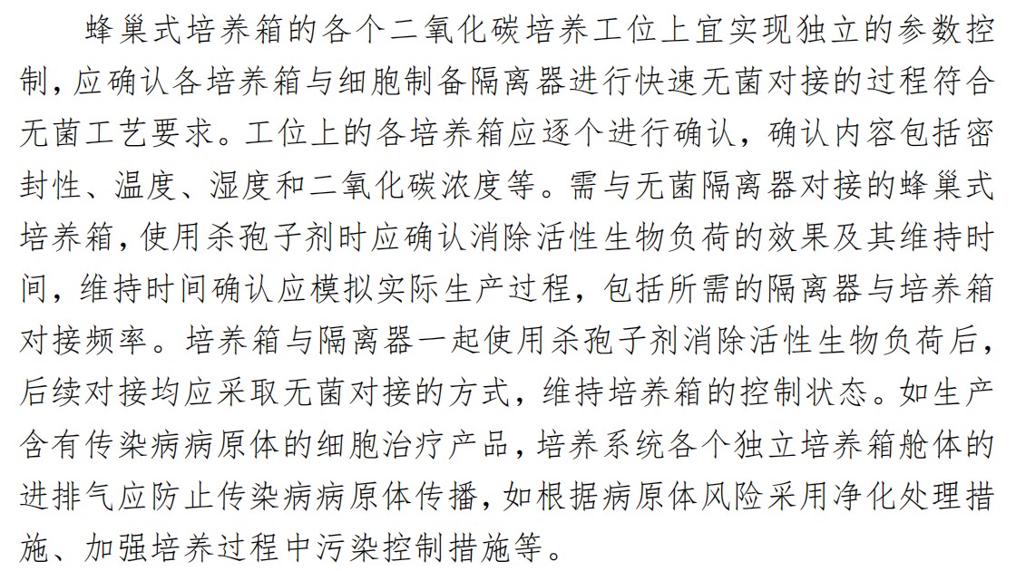 蜂巢培養箱是由蜂巢式多工位模塊和配套的培養箱組成,為細胞培養的常用設備,在《指南》中也有較詳細的闡述,主要包括設備構成與內部環境要求、設備電源要求、氣源要求、參數和性能的確認等。