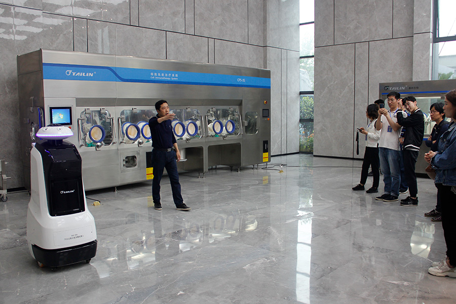 泰林生物副總經(jīng)理夏信群向各位領(lǐng)導(dǎo)、專家們介紹正在自動行走的滅菌機(jī)器人,以及應(yīng)用于CAR-T細(xì)胞治療的細(xì)胞治療工作站。